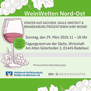 Am 29. März führt der Weinbauverband Sachsen die Veranstaltung WeinWelten Nord-Ost im "Historische Güterboden“ (Am Alten Güterboden 3) in Radebeul durch. Wir sind ebenfalls dabei und im Rahmen der Veranstaltung, die von 11 bis 18 Uhr dauert, bieten wir unseren neuen Jahrgang zum Verkosten an. Die Veranstaltung richtet sich am 29. März an Privatkunden und ist so eine gute Gelegenheit, verschiedene Weine verschiedener Winzer zu probieren.